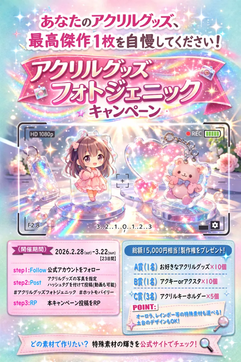 ・ご投稿いただいた画像やアイデア、景品として制作したアクリルグッズのデザインは、当社SNSやWebサイト等でご紹介させていただく場合がございます。あらかじめご了承ください。