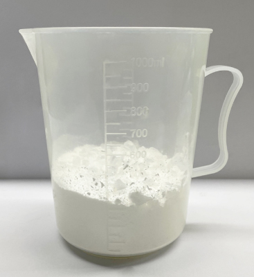 配管ほど硬くないのは、可塑剤というプラスチックを軟化させる材料を混ぜて製品にしています。この影響でゴムの様な柔らかな仕上がりになります。下の写真の様にプラスチック(塩ビ)は粉体状になってます。色は白色です。可塑剤は油状の液体です。この2つの材料を撹拌機に入れて良くかき混ぜます。
