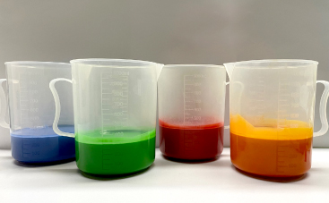 ラバーストラップ・ラバーキーホルダーを作る際は、最初にお客様の希望する色と同じ色の原料を準備します。原料は上記で説明した塩ビの粉体と液体の可塑剤を混ぜ合わせたものに染料を入れて着色をします。この段階では着色した絵具の様な液体です。この液体を型に注いで熱をかけると固まってゴム状の固体になります。