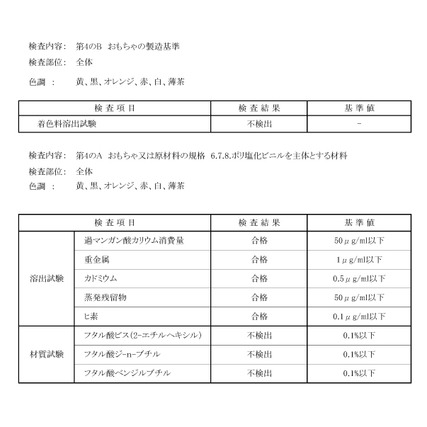 この様な懸念からホットモバイリーではフタル酸エステルを含まない可塑剤を使用する事で高い安全性を確保しています。厚生労働省が定める、「食品、添加物等の規格基準 第4 おもちゃ」の検査を定期的に実施、合格する事を確認しております。