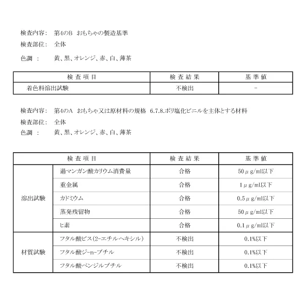 A24. ATBC-PVC(非フタル酸エステル系)のPVCを使用しており、変形や変色が少なく、ゴムの臭いも少ない高品質な素材です。『食品、添加物等の規格基準 第4 おもちゃ』の検査に合格した原料を使用しております。生産の際には、最初にお客様の希望する色と同じ色の原料を準備します。原料を準備した段階では絵具のような液体ですが、この液体を型に注いで熱をかけると固まってゴム状の固体になります。