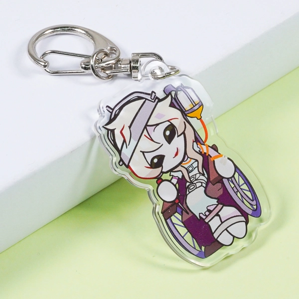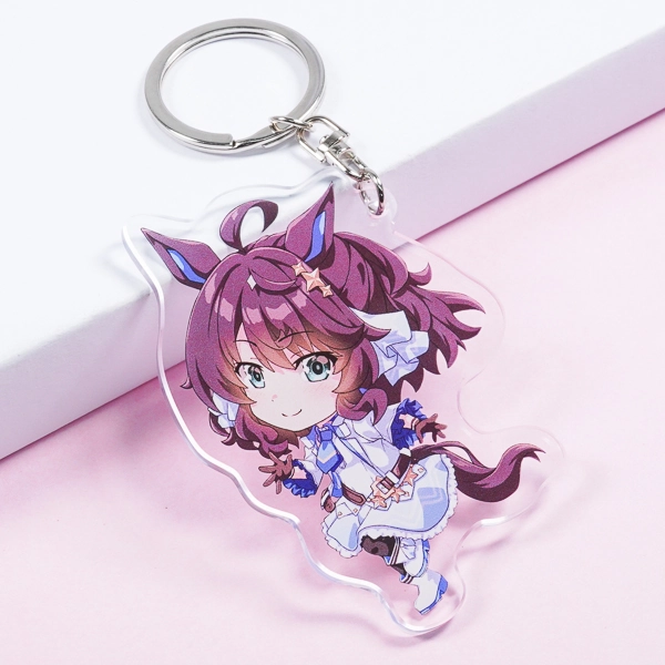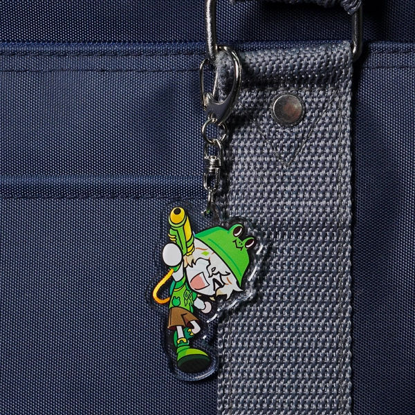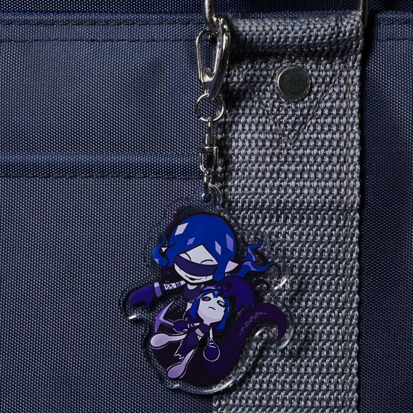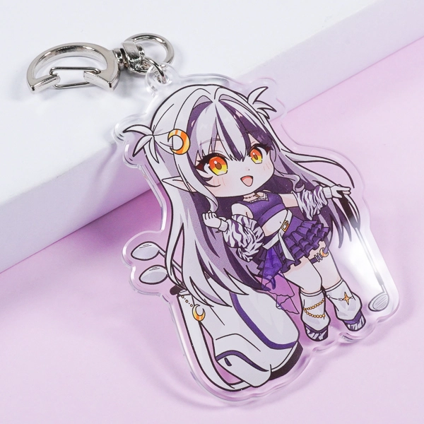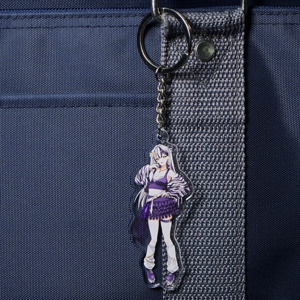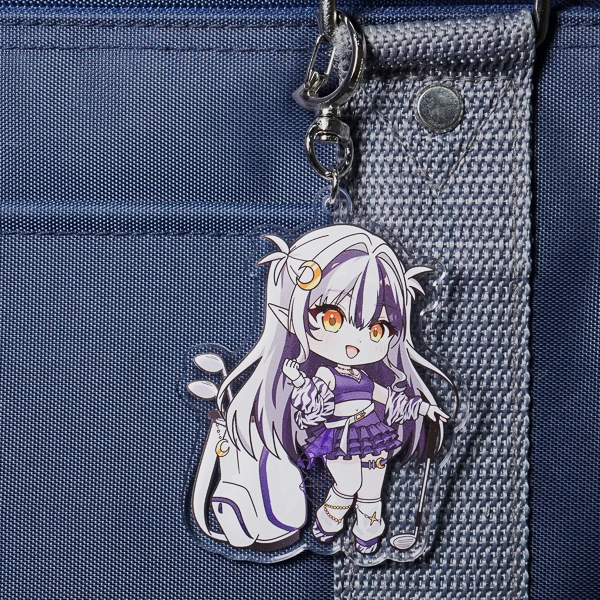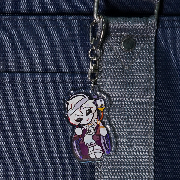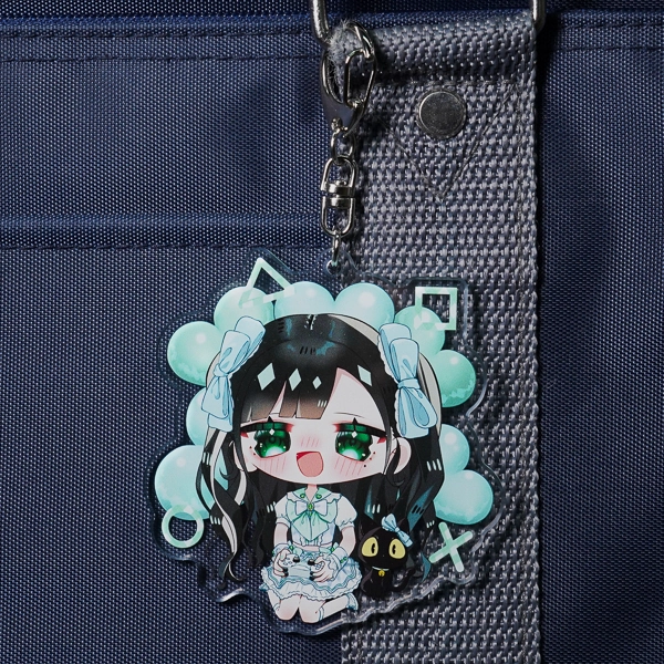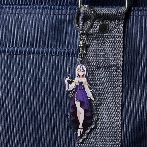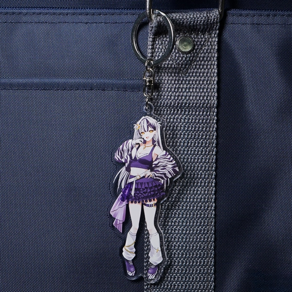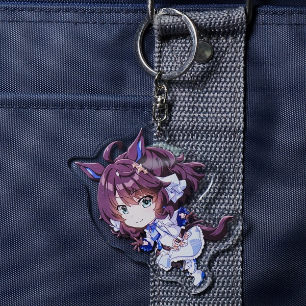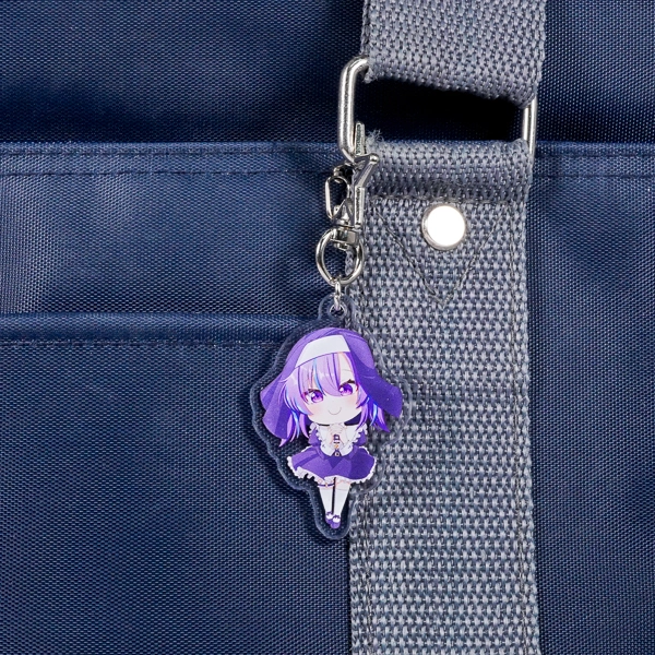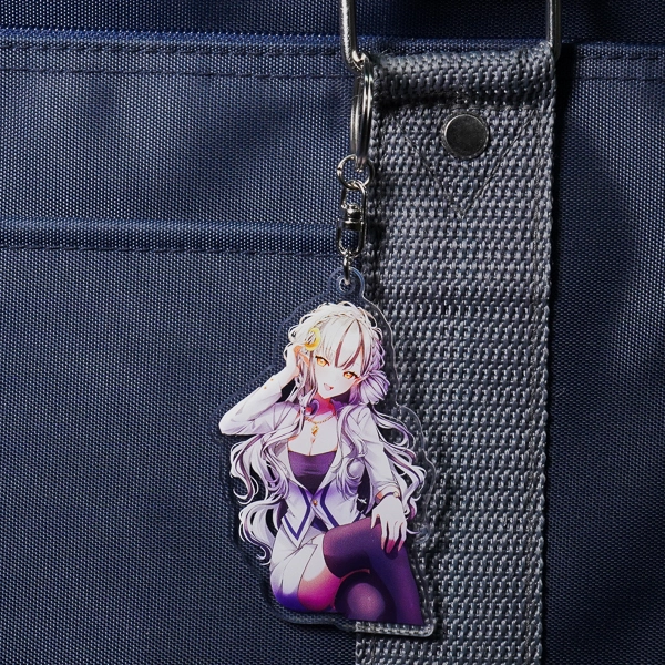 | 一言コメント | 大きなキャディバッグとゴルフクラブを持った、紫を基調としたスポーティで可愛らしいちびキャラデザインのアクリルキーホルダーです。キャラクターの髪飾りや衣装に散りばめられた三日月モチーフに合わせて、取り付け金具にも珍しい「月型ナスカン」が採用されており、グッズ全体で統一感のある世界観が表現されています。また、スカートのフリルの一部はあえて背景を透過させることでシースルー素材の透け感を表現しており、アクリル素材ならではの特性を活かしたこだわりの仕上がりです。 |