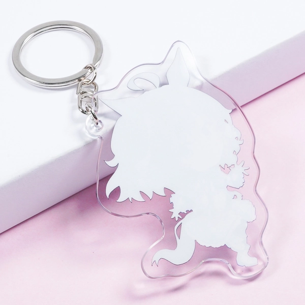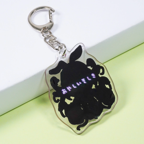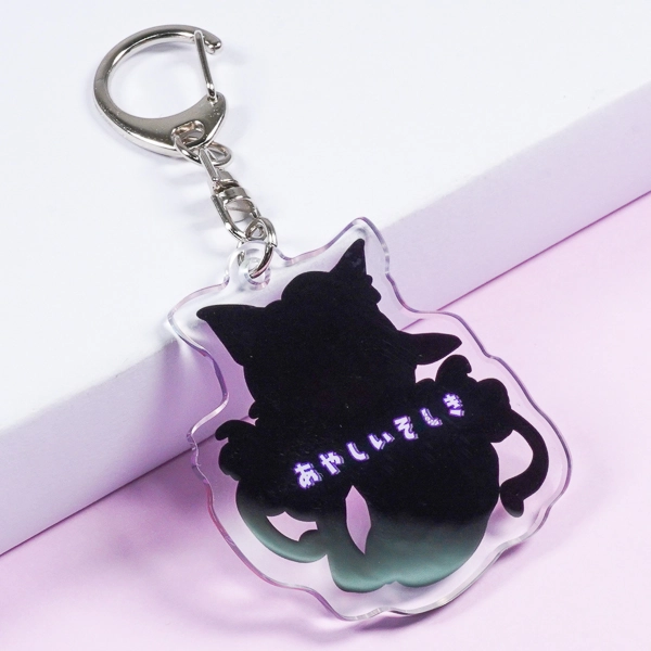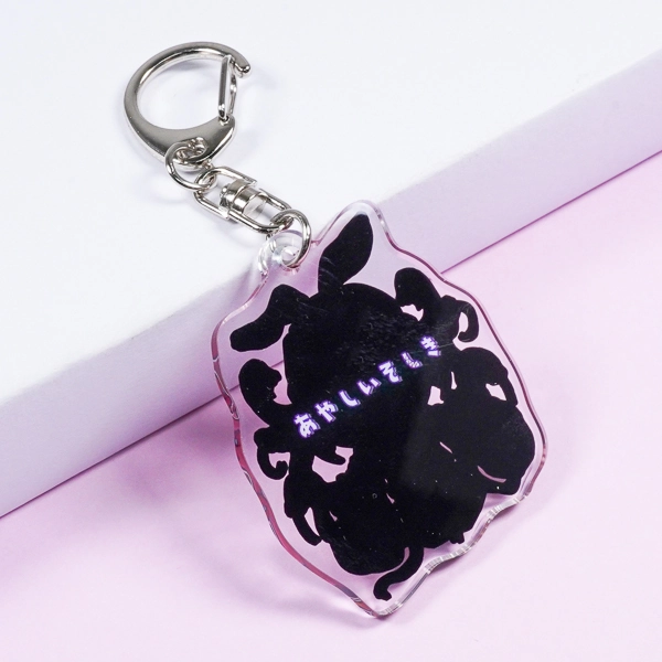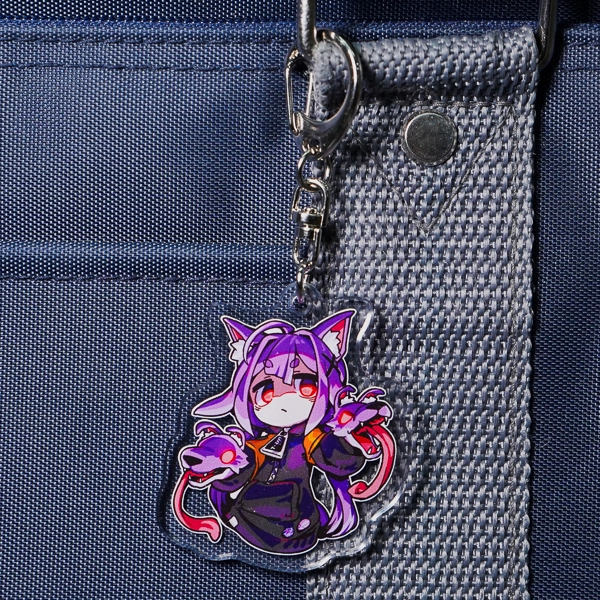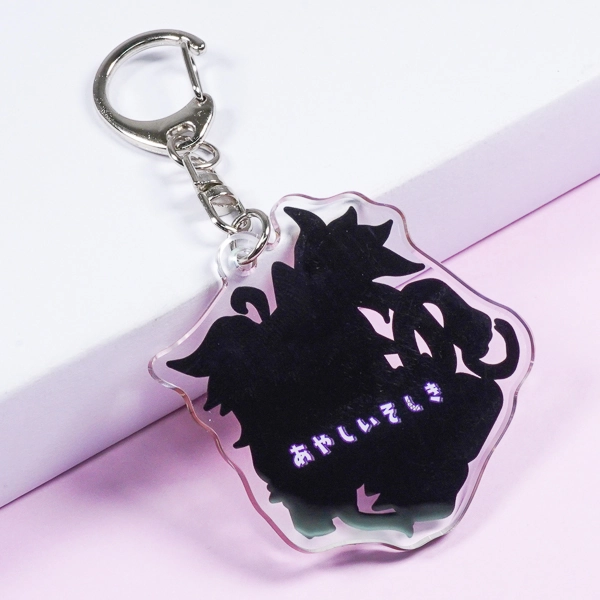 | 一言コメント | 紫色の髪に獣耳を持ったキャラクターと、ケルベロスのような魔物たちが一緒に描かれた、ダークファンタジー風のちびキャラデザインです。こちらもシリーズ共通のこだわりとして、裏面は通常の白ではなく「黒のベタ塗り」を採用し、暗闇から浮かび上がるような「あやしいそしき」のテキストを配置しています。アクリルの両面を効果的に使い、キャラクターのミステリアスな設定や世界観を表現した、遊び心あふれるグッズに仕上がっています。 |