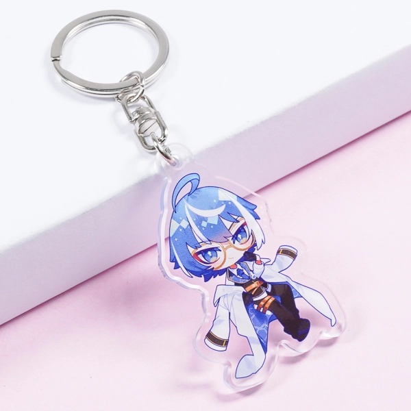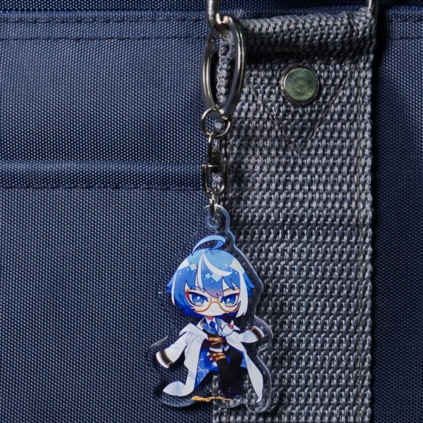 | 一言コメント | 鮮やかなブルーの髪と白衣が目を引く、知的な印象のちびキャラデザインです。髪の毛に描かれたドット柄のハイライトや、瞳のグラデーション、丸眼鏡といった細かなデザイン要素もフルカラー印刷で綺麗に表現されています。 |