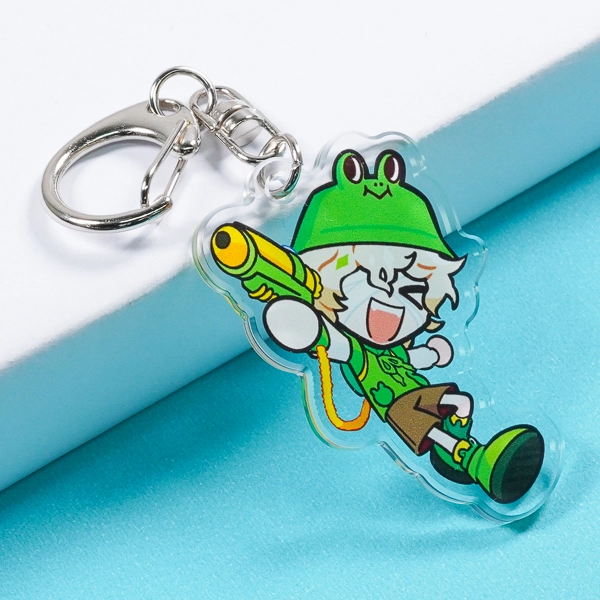 | 一言コメント | カエルをモチーフにした帽子と、大きな水鉄砲の組み合わせがユニークなちびキャラデザインです。グリーンとイエローを基調としたビビッドでポップな配色が、キャラクターの明るくアクティブな雰囲気を引き立てています。 |