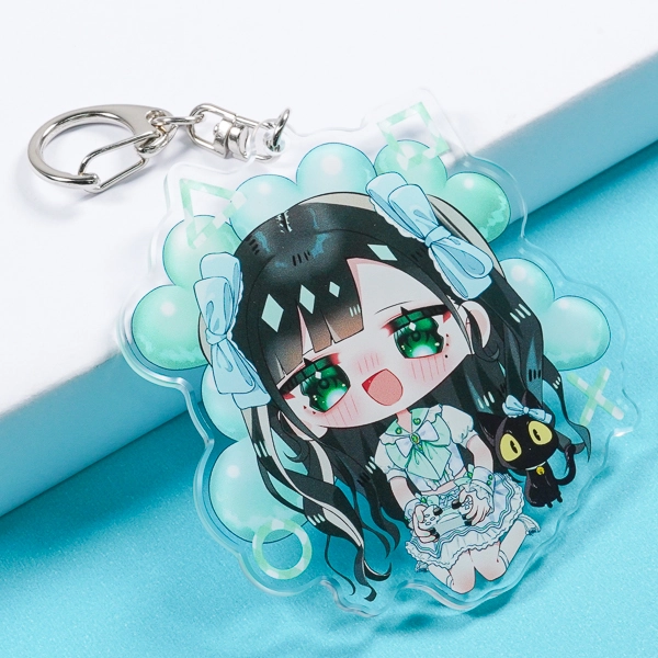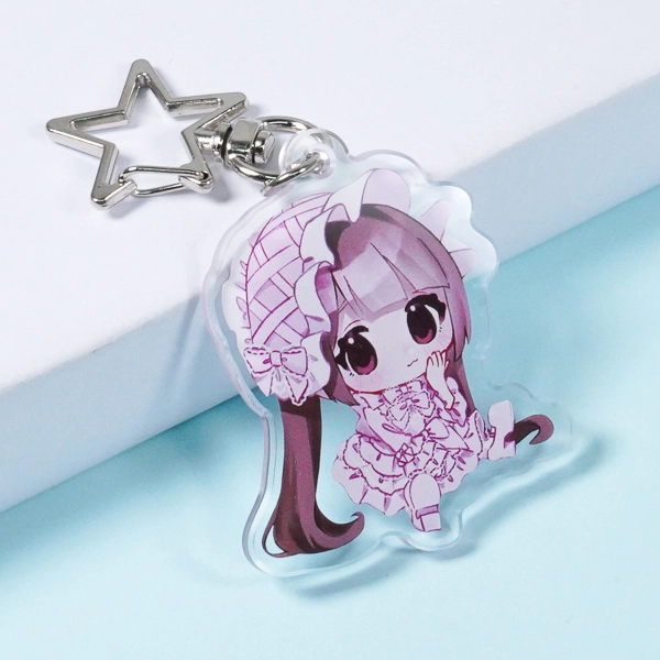 | 一言コメント | 淡いピンクとパープルを基調とした、ロリータファッションの女の子を描いたアクリルキーホルダーです。フリルたっぷりのドレスや大きなボンネットを被った可憐なちびキャラのシルエットに合わせて、アクリルがダイカット(切り抜き)されています。キャラクターの「ゆめかわいい」雰囲気にぴったりな星型のナスカン(取り付け金具)を組み合わせることで、カバンにつけた際の可愛らしさがさらに引き立つ、こだわりのオリジナルグッズに仕上がっています。 |