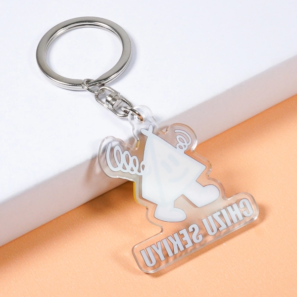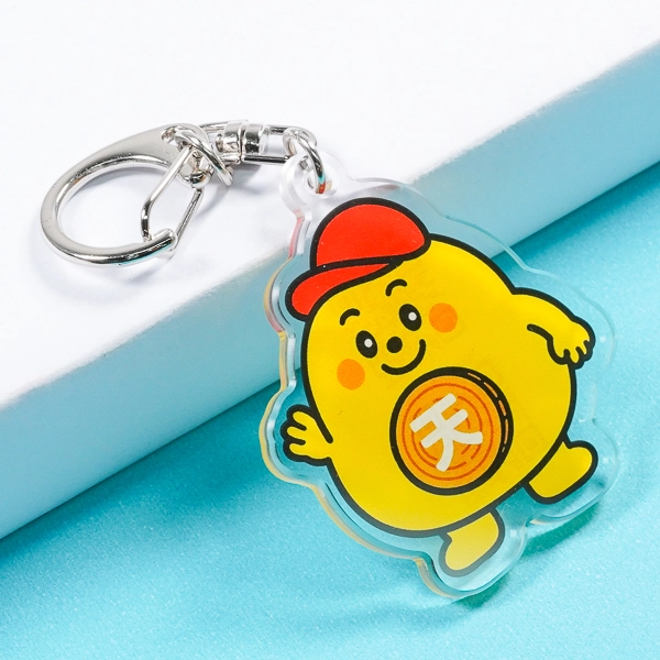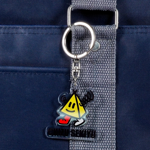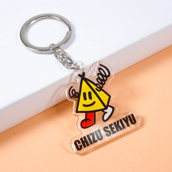 | 一言コメント | 鮮やかなイエローカラーが目を引く、三角形のユニークなキャラクターを描いたアクリルキーホルダーです。にっこり笑った愛嬌のある表情や、ポップな動きを感じさせる手足のデザインが親しみやすさを演出しています。下部には「CHIZU SEKIYU」の企業名が配置されており、キャラクターとロゴが一体となったダイカット(切り抜き)形状に仕上がっています。展示会での配布用ノベルティや企業のPRグッズとして、ブランドイメージを楽しくアピールできる魅力的なデザインです。 |