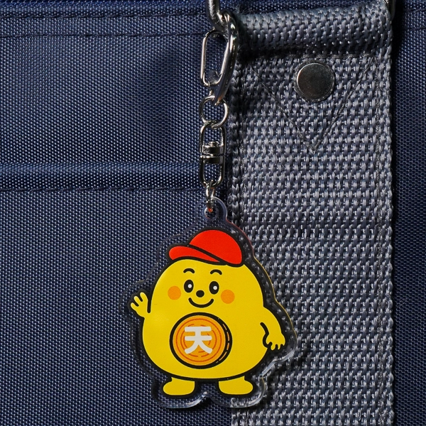 | 一言コメント | 赤い帽子とぽってりとした黄色いフォルムが親しみやすい、企業マスコットキャラクターのデザインです。お腹の部分にあしらわれた木の年輪のような模様と「天」のロゴマークが、キャラクターのユニークな個性を引き立てています。 |