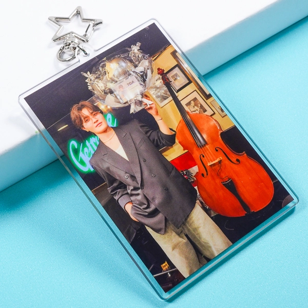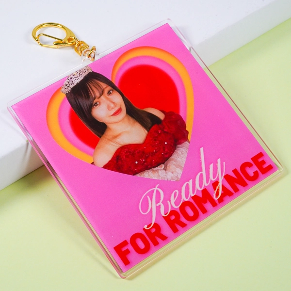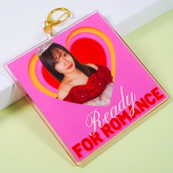 | 一言コメント | ビビッドなピンク色の背景に、ドレス姿の女性の実写写真を大きく配置したアクリルキーホルダーです。写真をハート型に切り抜いたポップなレイアウトと、下部に添えられた英字タイポグラフィの組み合わせが、まるでCDジャケットのような華やかなデザインに仕上がっています。安定感のある四角形(スクエア型)のアクリル板を使用し、高級感のあるゴールドのナスカンを合わせることで、アイドルの生誕祭やイベント向けの「推し活グッズ」として特別感あふれるアイテムになっています。 |