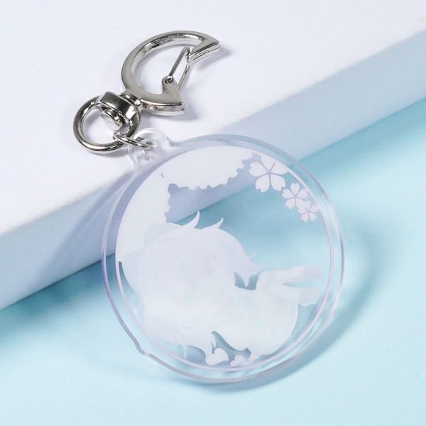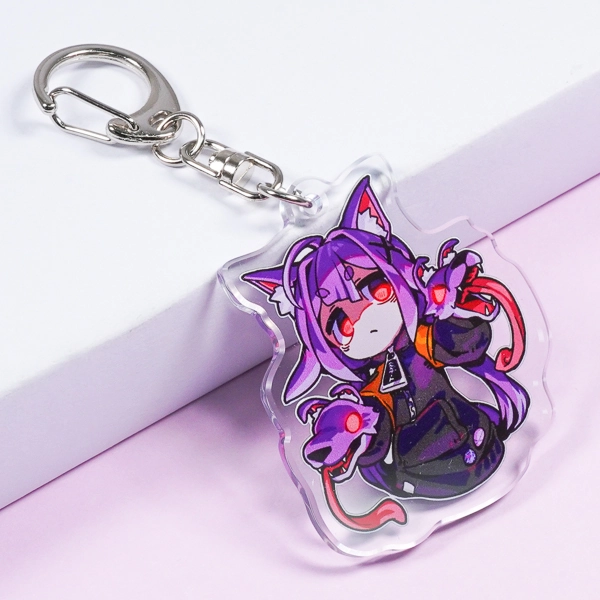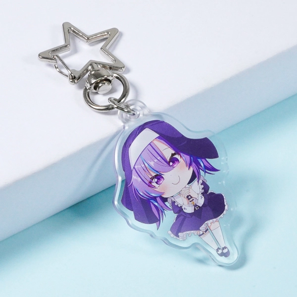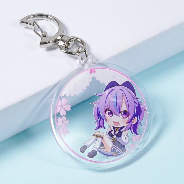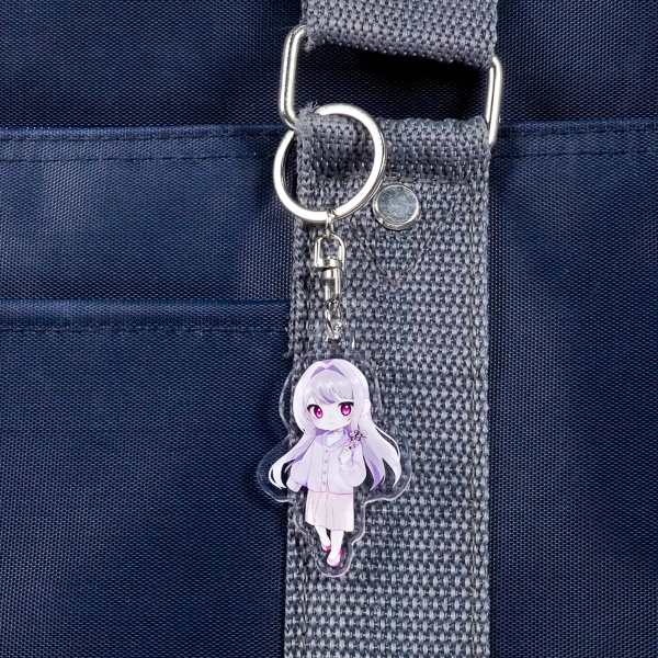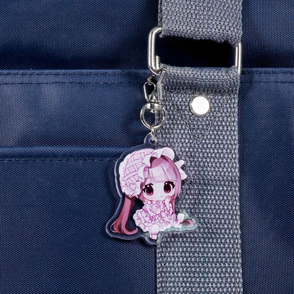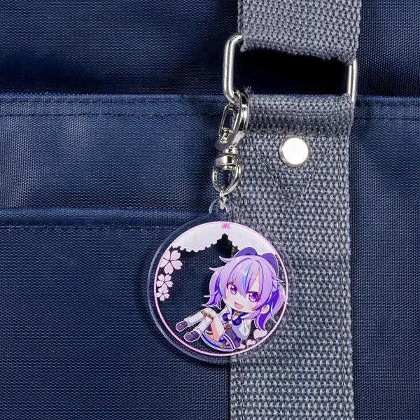 | 一言コメント | 紫色の髪がキュートなちびキャラを描いた、使いやすい円形(サークル)のアクリルキーホルダーです。背景に散りばめられた桜の花びらやレースのモチーフを残しつつ、余白部分をあえて透明(透かし)にすることで、キャラクターがふんわりと空間に浮かび上がるような奥行きのあるデザインに仕上がっています。イラストのロマンチックな雰囲気に合わせて選ばれた「月型」のナスカンが、グッズ全体の可愛らしさをさらに引き立てています。 |