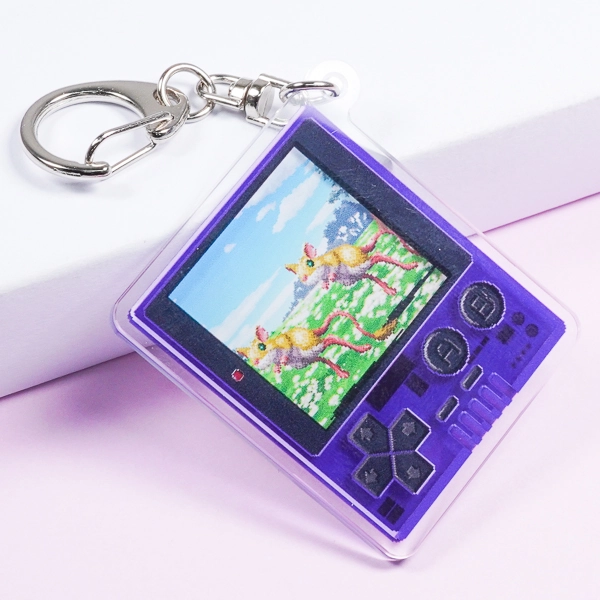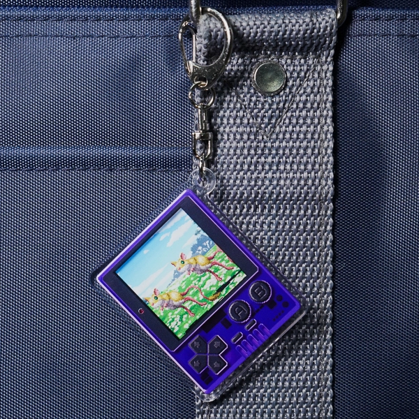 | 一言コメント | 鮮やかな紫色のスケルトンボディが目を引く、携帯型ゲーム機をモチーフにしたアクリルキーホルダーです。画面の中にはドット絵(ピクセルアート)でフィールドやモンスターが描かれており、レトロゲームの世界をそのまま切り取って持ち歩けるようなワクワクするデザインに仕上がっています。シンプルな長方形(スクエア型)のフォルムとノスタルジックなモチーフの組み合わせは、サブカル系のアパレル雑貨や同人グッズとしても非常に魅力的です。 |
