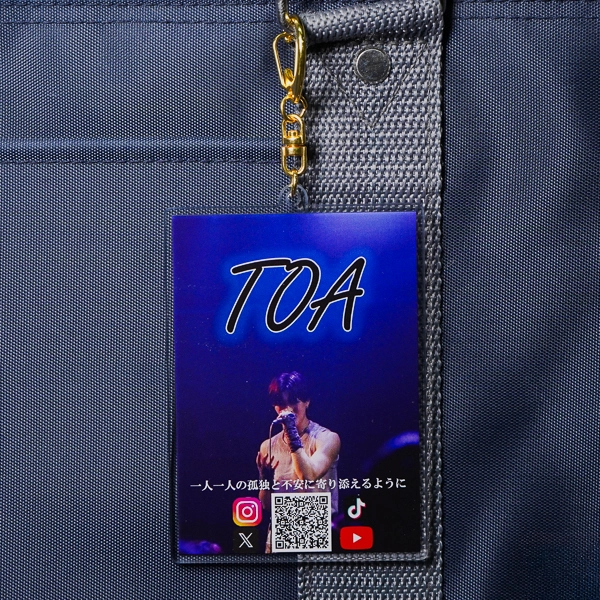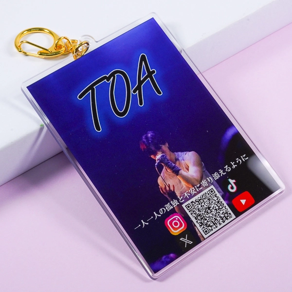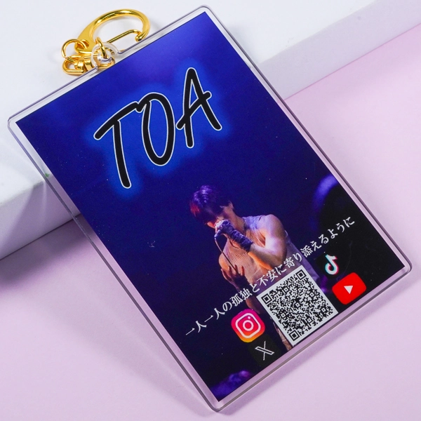 | 一言コメント | アーティストの熱気あるライブ写真を全面に配置した、ポスター風レイアウトのアクリルキーホルダーです。写真下部にはファンへのメッセージと共に、各種SNS(Instagram、X、TikTok、YouTube)への導線となるQRコードがデザインされています。ライブ会場で販売する「推し活グッズ」としての魅力はもちろん、手に取ったファンを直接メディアへ誘導できる、実用的なプロモーション・販促アイテムとしても非常に優秀な構成です。デザインに合わせて選ばれたゴールドのナスカンが、特別感と高級感をプラスしています。 |