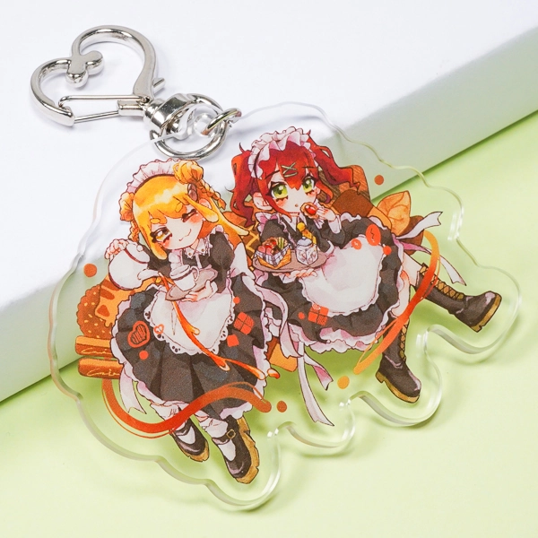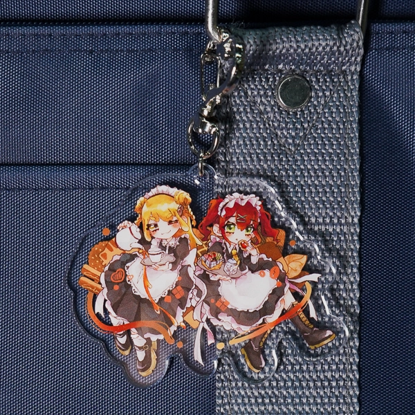 | 一言コメント | ティータイムを楽しむ、メイド服姿の2人の女の子を描いたアクリルキーホルダーです。フリルたっぷりのクラシックなメイド服に、温かみのあるオレンジ色のリボンや小物が差し色となり、華やかで可愛らしいデザインに仕上がっています。取り付け金具にはキュートな「ハート型ナスカン」が採用されており、同人イベントのグッズやコンカフェ(メイドカフェ)のオリジナルアイテムとして、世界観にぴったりとマッチする組み合わせです。 |