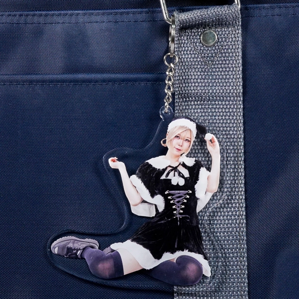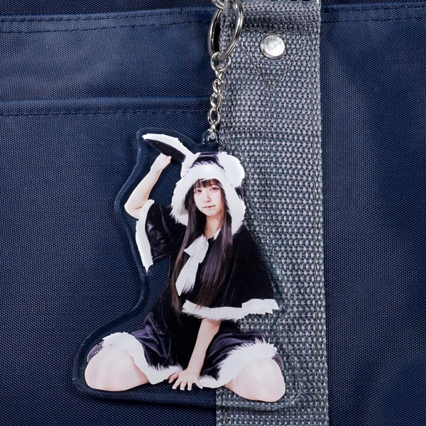 | 一言コメント | うさ耳の黒サンタ衣装が可愛らしい、実写(人物)のアクリルキーホルダーです。被写体の座りポーズに合わせて余白を切り抜いたダイカット形状になっており、写真の魅力をそのまま活かしたデザインに仕上がっています。 |