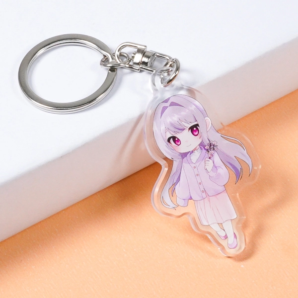 | 一言コメント | 淡いパープルを基調とした、ふんわりと優しい雰囲気の女の子を描いたアクリルキーホルダーです。ゆったりとしたカーディガンを羽織り、小さな花を手にした可憐なちびキャラ(デフォルメ)デザインに仕上がっています。キャラクターの愛らしいシルエットに合わせてアクリルがダイカット(切り抜き)されており、オリジナルキャラクターグッズや同人アイテムとして、カバンやポーチのワンポイントにぴったりです。 |