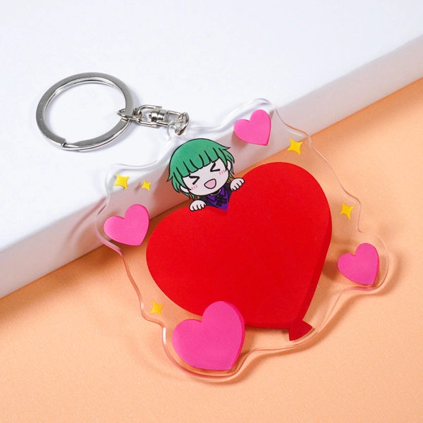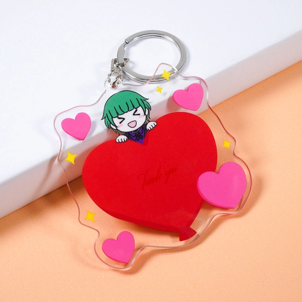 | 一言コメント | 大きな赤いハートから、満面の笑みを浮かべた緑髪のちびキャラが顔を覗かせるアクリルキーホルダーです。周囲に散りばめられた小さなピンクのハートや星のモチーフが、ポップで楽しげな雰囲気を演出しています。さらに、裏面を見ると大きなハート部分に「Thank you」というメッセージが現れる遊び心のあるデザインになっており、ファンへの感謝を伝えるノベルティや記念品としても喜ばれる、素敵なアイデアが詰まっています。 |