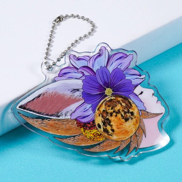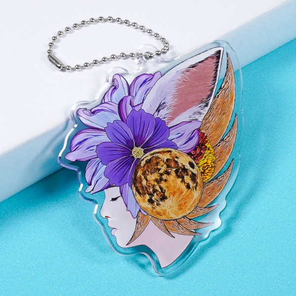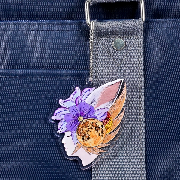 | 一言コメント | 伏し目がちな女性の美しい横顔に、大輪の紫の花、リアルな満月、そして動物の耳が融合した、幻想的でアートなアクリルキーホルダーです。月の模様や花びらのグラデーションまで色鮮やかにプリントされた美しい発色が、神秘的な和風ファンタジーの世界観をより一層引き立てています。イラストの複雑なシルエットに合わせたダイカット仕様により、まるでひとつの絵画を持ち歩くような特別感があり、クリエイターの個展グッズやアート系イベントでのオリジナルアイテムとして目を引く洗練されたデザインです。 |