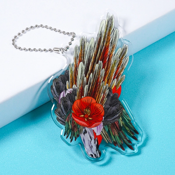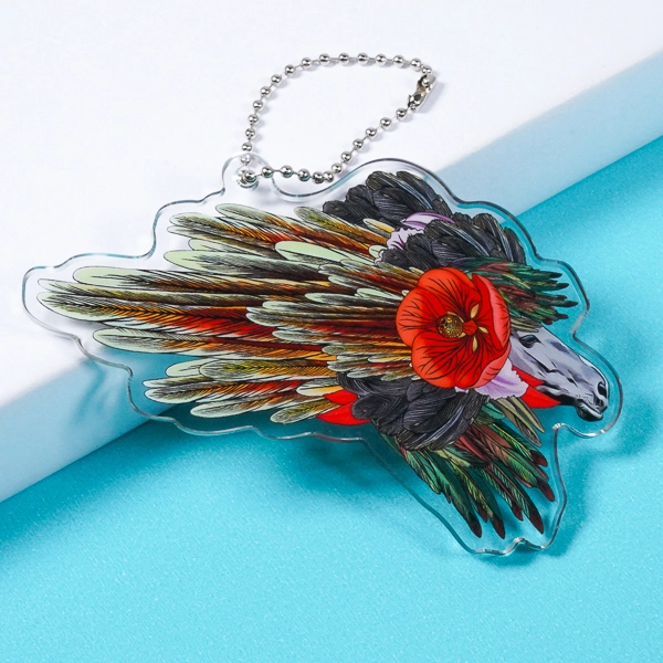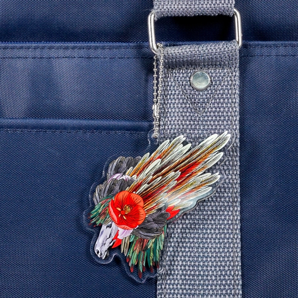 | 一言コメント | 動物の横顔に、鮮やかな赤い花と大きく広がる翼のような羽が組み合わされた、非常に芸術的でインパクトのあるアクリルキーホルダーです。一本一本の羽の質感や、花のグラデーションまで色鮮やかにプリントされた美しい発色が、イラストの緻密な描き込みをより一層際立たせています。複雑なモチーフの輪郭をそのまま活かしたダイカット仕様により、カバンにつければまるでアート作品を持ち歩いているかのような特別感があります。クリエイターの個展やミュージアムのオリジナルグッズとして、独自の世界観を放つ洗練されたデザインです。 |