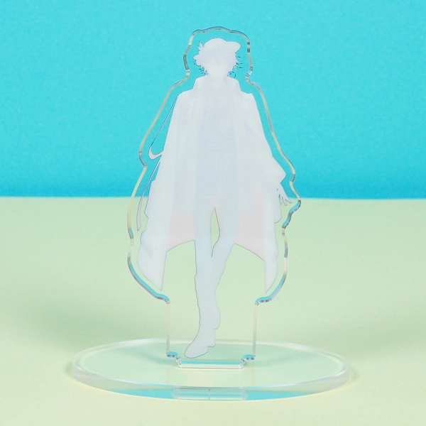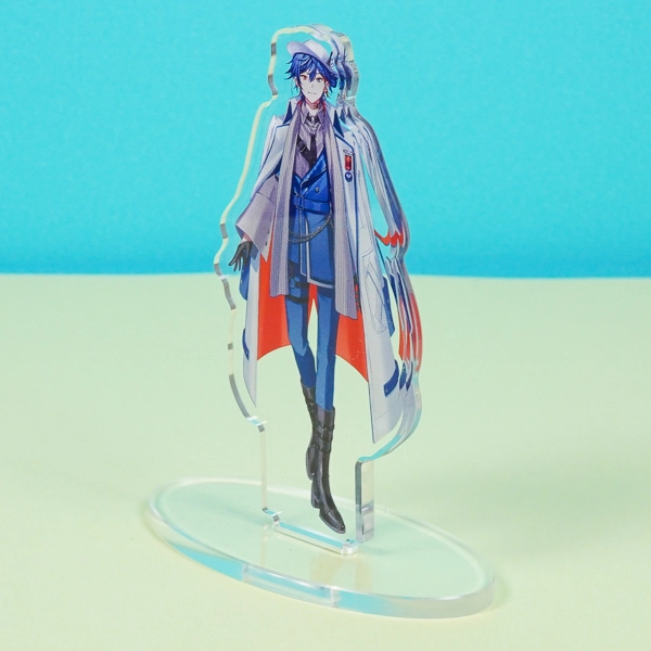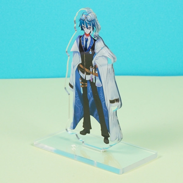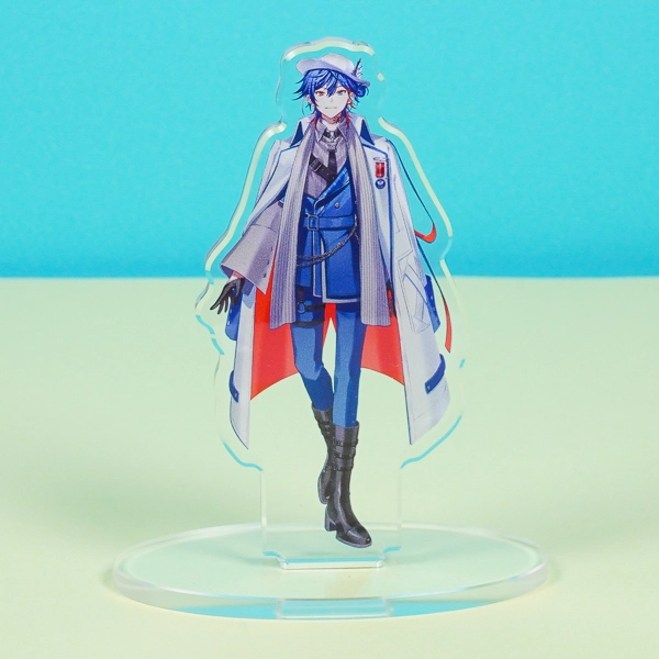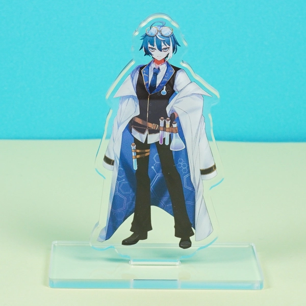 | 一言コメント | 白衣をふわりと羽織り、試験管やフラスコを身につけた研究者風の男性キャラクターを描いたアクリルスタンドです。青を基調としたクールな衣装や、頭に乗せたゴーグルといったこだわりのディテールが目を引きます。キャラクターの全身イラスト(立ち絵)をすっきりと見せるシンプルな長方形のクリア台座を採用しており、ゲームやアニメのオリジナルグッズ、または同人アイテムとして、デスク周りに飾って作品の世界観を楽しめる魅力的なデザインです。 |