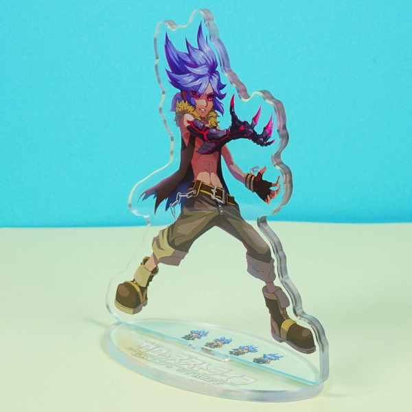 | 一言コメント | 異形化した迫力ある右腕と、紫色のスパイキーヘアが目を引くダークファンタジー調のキャラクターデザインです。台座部分には可愛らしいドット絵のミニキャラとロゴが配置されており、RPGやアクションゲームのような独自の世界観が細部まで表現されています。 |
