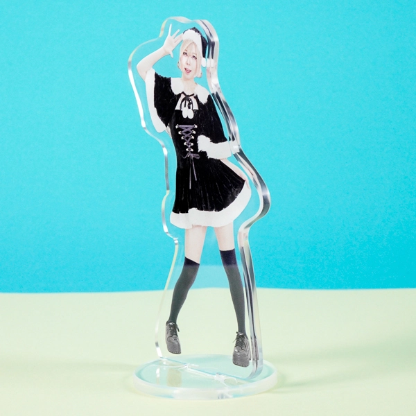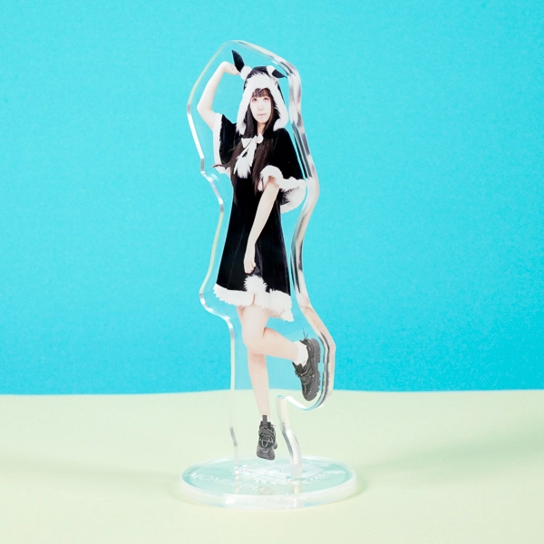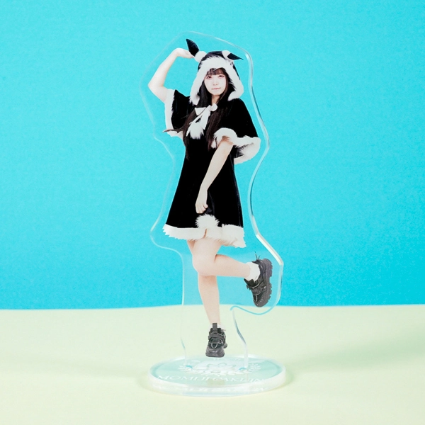 | 一言コメント | アニマル耳のついたフードと、白黒のコントラストが印象的な衣装に身を包んだ実写人物のアクリルスタンドです。片足を上げた軽やかなポーズに合わせてアクリルがカットされており、ご本人の可愛らしい雰囲気や衣装のファーの質感などがそのまま魅力的なグッズとして表現されています。 |