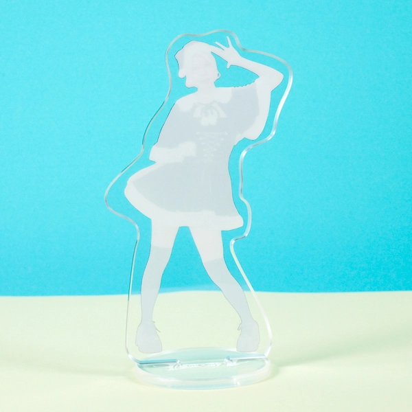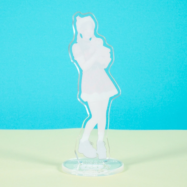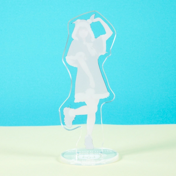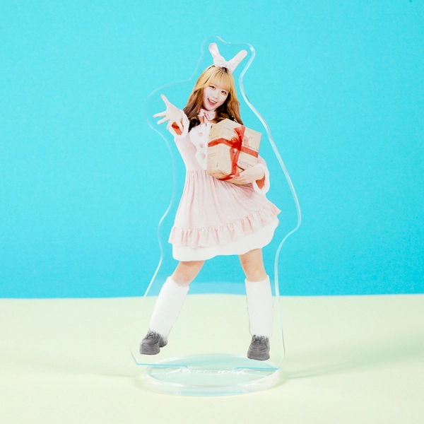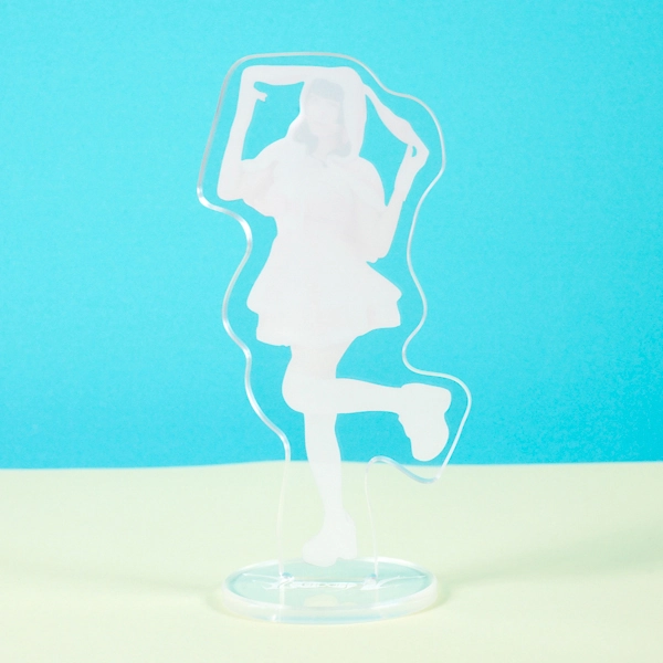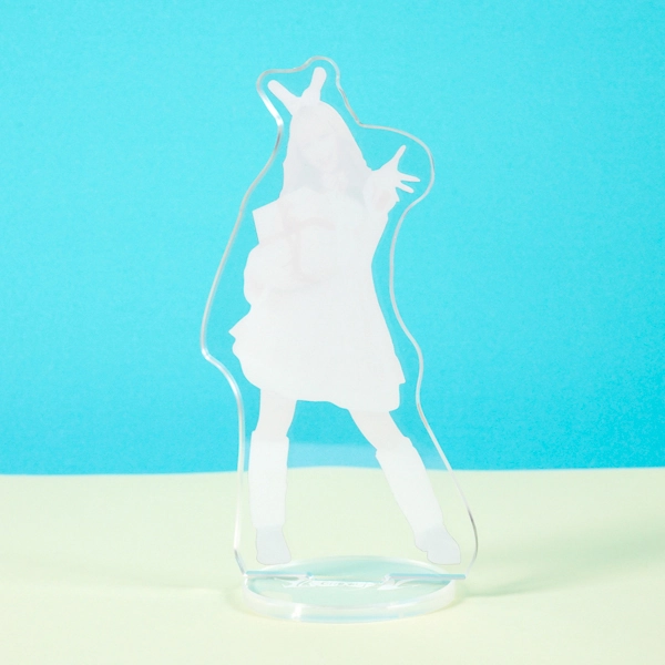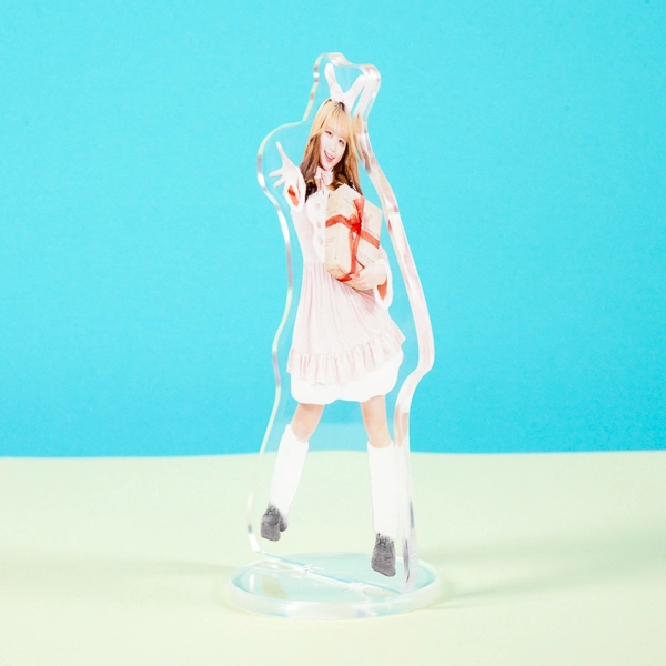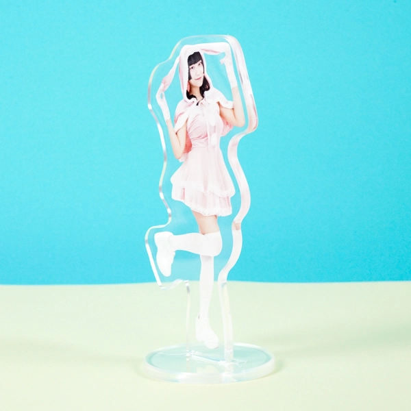 | 一言コメント | うさ耳付きのピンク色のケープと、白いフリルワンピースの組み合わせが可愛らしい実写人物のアクリルスタンドです。フードのうさぎの耳を掴んで片足を上げたキュートで躍動感のあるポージングに合わせてアクリルがカットされており、ご本人の愛らしい魅力やパステルカラーのふんわりとした雰囲気が引き立つデザインになっています。 |