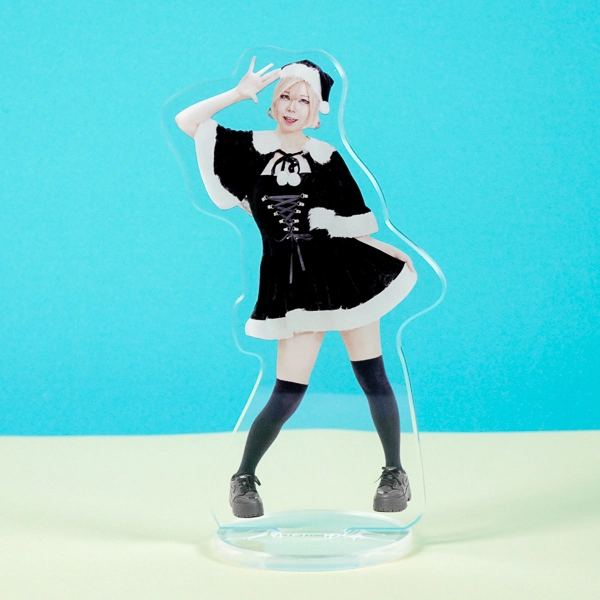 | 一言コメント | 胸元の編み上げリボンと白いファーのコントラストが可愛らしい、ブラックサンタ風の衣装を身にまとった実写人物のアクリルスタンドです。ふわりと広がるスカートを持った元気でチャーミングなポージングが、ご本人の魅力や衣装のディテールを立体的に引き立てるデザインになっています。 |