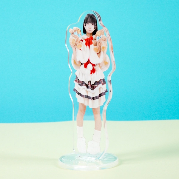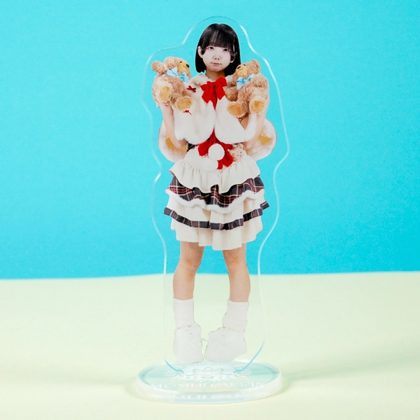 | 一言コメント | 2つのテディベアを胸元に抱えた、実写人物のアクリルスタンドです。ふんわりとした白いフリルにチェック柄のラインがアクセントになった衣装や、大きな赤いリボン、ファー素材のケープがとても可愛らしい印象を与えます。人物だけでなくお気に入りのぬいぐるみ等の小物を一緒に配置することで、ご本人の愛らしい魅力や独自の世界観がより一層引き立つデザインになっています。 |