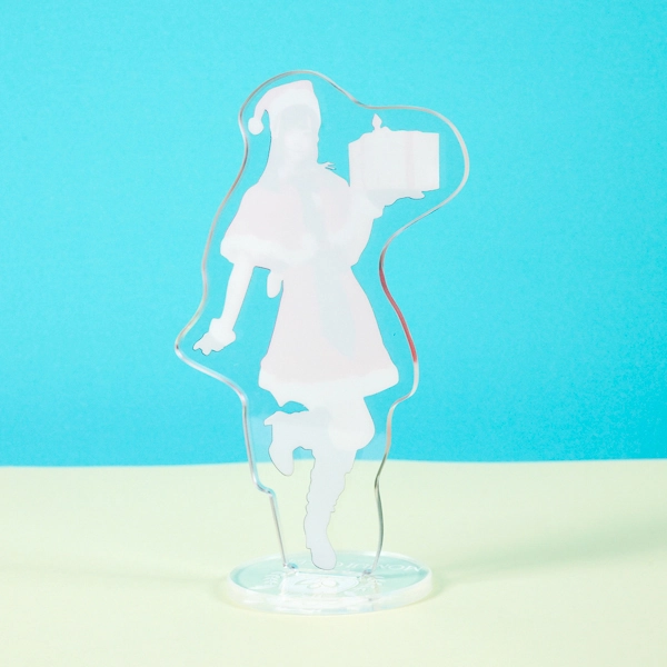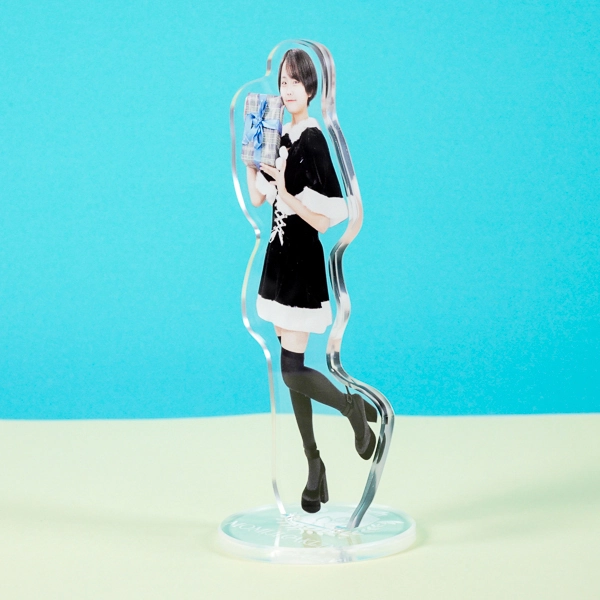 | 一言コメント | 青いリボンのプレゼントを手に、片足を跳ね上げた元気なポーズが特徴的なブラックサンタ風衣装の女性。黒のミニワンピースに白いファーの縁取り、胸元の編み上げリボンといったディテールが、実写ならではの存在感で表現されています。躍動感のあるシルエットに合わせた正確なカットラインが、アクリルスタンドとしての魅力を最大限に引き出しており、ファン必見のアイテムです。 |