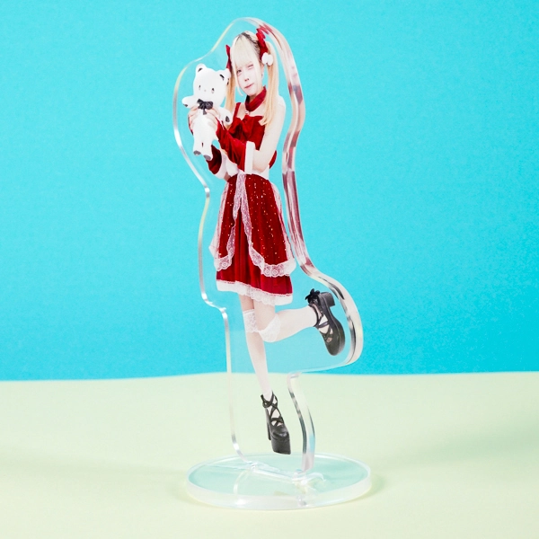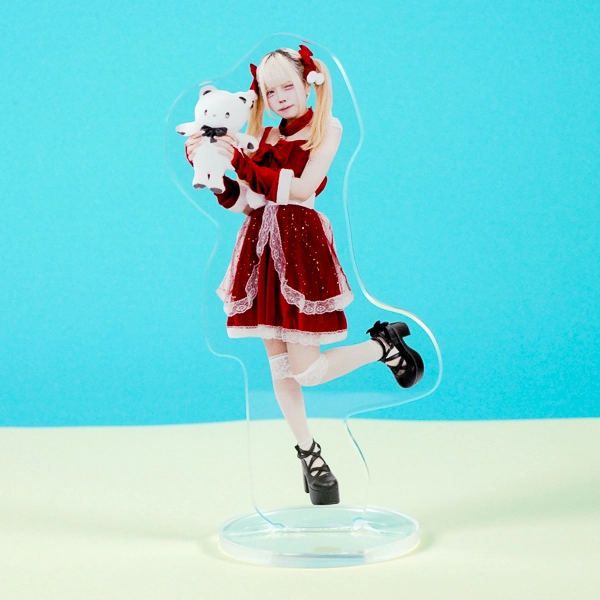 | 一言コメント | 白いクマのぬいぐるみを抱きしめた、実写人物のアクリルスタンドです。金髪のツインテールと、レースがあしらわれた赤いベロア調のワンピースが非常にマッチしており、片足を跳ね上げた元気で可愛らしいポージングのシルエットが、ご本人のキュートな魅力をより一層引き立てるデザインになっています。 |