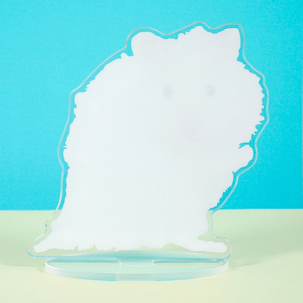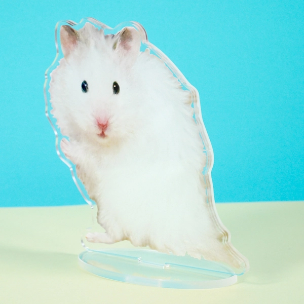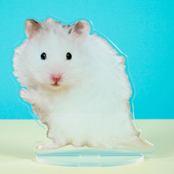 | 一言コメント | 白くてふわふわな毛並みが愛らしい、ハムスターの実写アクリルスタンドです。少し立ち上がってこちらをじっと見つめるような、つぶらな瞳とキュートなポーズに合わせてアクリルがカットされています。大切なペットのベストショットをそのまま切り取ったような、見ているだけで癒やされるデザインです。 |