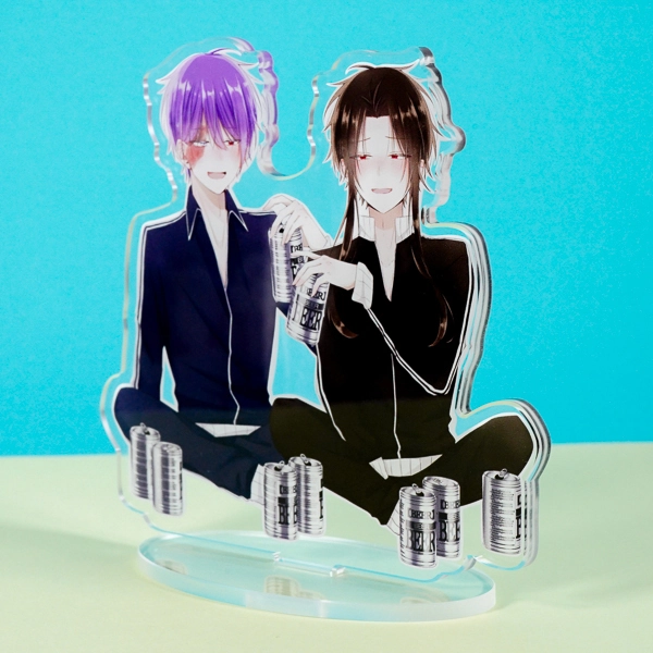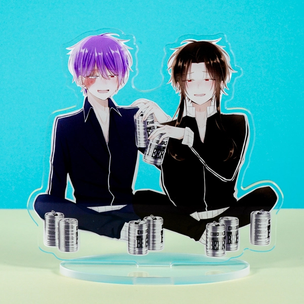 | 一言コメント | 黒いシャツのラフなスタイルで、ビールを片手に楽しく晩酌をしている二人の男性キャラクターのアクリルスタンドです。少し頬を赤らめてリラックスした表情や、二人の足元にゴロゴロと転がる複数の空き缶など、キャラクターたちの仲の良さや日常のワンシーンが伝わってくるようなストーリー性のあるデザインが魅力的です。 |