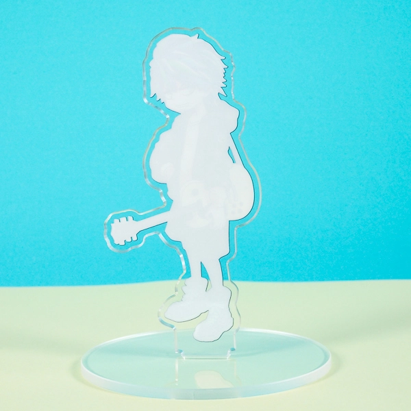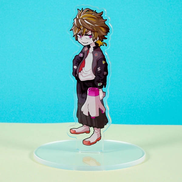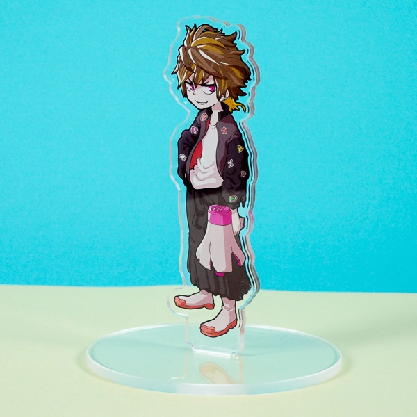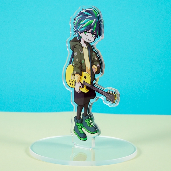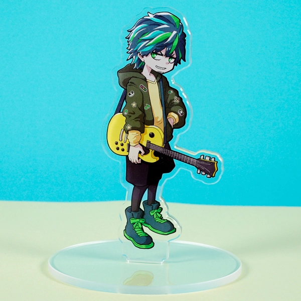 | 一言コメント | 黄色のエレキギターを片手に提げた、バンドマン風の男性キャラクターのアクリルスタンドです。グリーンのメッシュが入った髪型と、ワッペン付きのパーカーにハーフパンツというラフなスタイルが、キャラクターの音楽性やストリート感を表現したクールなデザインに仕上がっています。 |