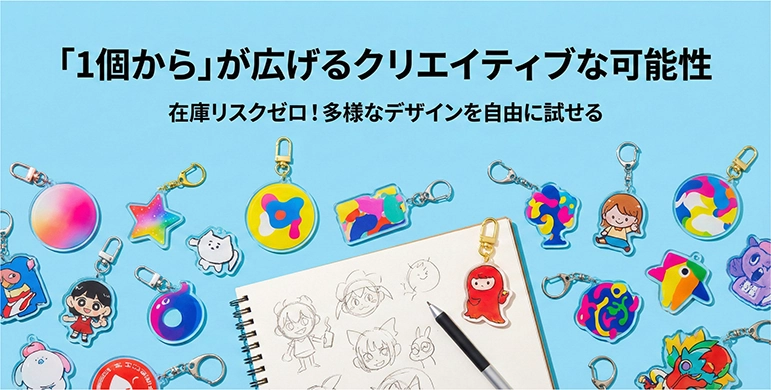 アクリルキーホルダー、通称「アクキー」。 透明感あふれるクリアな素材に、鮮やかな色彩が踊るこのアイテムは、クリエイターにとって特別な存在です。しかし、いざ「自分のデザインで作りたい!」と思い立っても、これまでは「最小ロット」という壁が立ちはだかることがありました。「最低10個から」「30個作らないと単価が高い」……そんな条件を見て、そっとブラウザを閉じてしまった経験がある方もいるかもしれません。