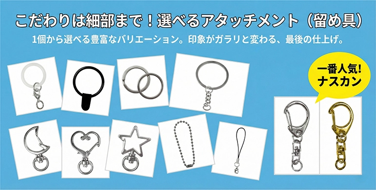 メインのデザインが決まったら、最後に選ぶのが「アタッチメント」です。キーホルダーをバッグやポーチに取り付けるための留め具ですが、ここを何にするかで、グッズ全体の印象がガラリと変わります。ホットモバイリーでは、1個からの注文でも豊富なバリエーションからお好みのパーツを選べます。