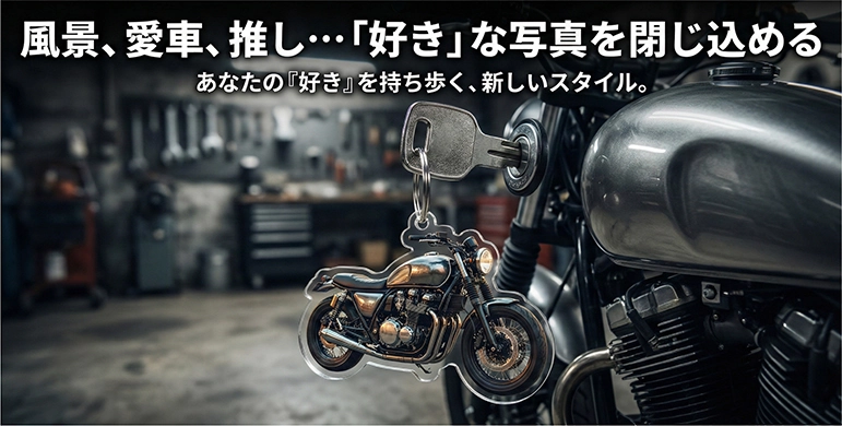 車やバイク好きにとって、愛車は単なる乗り物ではなく相棒です。 洗車してピカピカに磨き上げた愛車を、一番カッコいい角度から撮影した一枚。 車体の金属的な輝きやメカニカルなフォルムは、アクリルの硬質な質感と非常に相性が良く、クールな仕上がりのアクリルキーホルダーになります。 ナンバープレートの数字までくっきり見える高解像度のアクキーを、本物の車の鍵と一緒に束ねる。 この「愛車on愛車」の組み合わせは、オーナーの密かな所有欲を満たしてくれます。