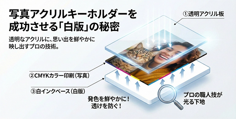 「でも、自分で撮った写真がそんなに綺麗にグッズになるの?」 そんな不安を持つ方もいるでしょう。 実は、写真を使ったアクリルキーホルダーが美しく見えるかどうかは、「白版(はくばん)」という工程にかかっています。