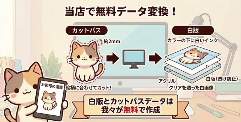 ・アクリルは透明な素材です。そのままカラー印刷すると色が透けてしまいます。透けさせないために、カラーインクの下に「白いインク」を敷きます。これを当店で作成します。