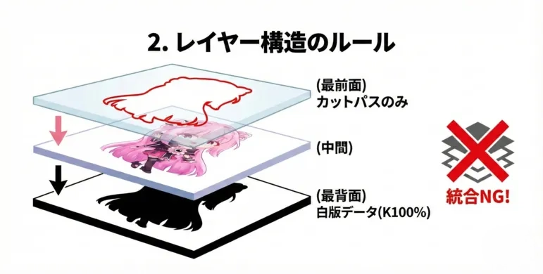 縮小処理: 印刷ズレによる「白のはみ出し」を防ぐため、カラーデータよりも0.1mm(1px程度)内側に縮小して作成することを強く推奨します。