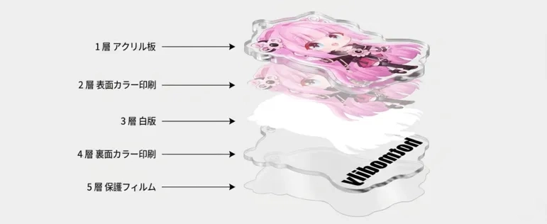 通常のアクリルグッズは「アクリル板にインクを吹き付けただけ(またはインクの上に簡易コート)」のものが多く、硬いものが当たると印刷が剥げることがあります。 一方、ホットモバイリーの製品は、印刷面全体を透明なPETフィルムで覆う構造 になっています。