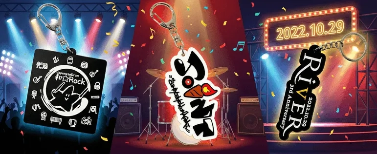 ライブ会場やファンミーティングでの物販アイテムとして、ラバーキーホルダーは高い人気を誇ります。アーティスト様ご本人のキャラクター化はもちろん、バンド名ロゴや、プロのイラストレーターが描いたモチーフなども作成可能です。