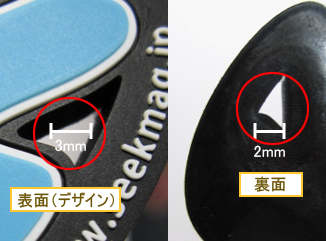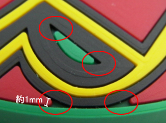 当店のラバー製品は厳密には表面(デザイン面)と裏面では裏面が若干大きくなります。この形状の特性上、デザインに貫通部を設けた際に表面よりも裏面の貫通部の穴が小さくなります。 表面で3mmの貫通部は裏面でおよそ2mmになります。(裏面貫通部のサイズ調整は出来ません。)