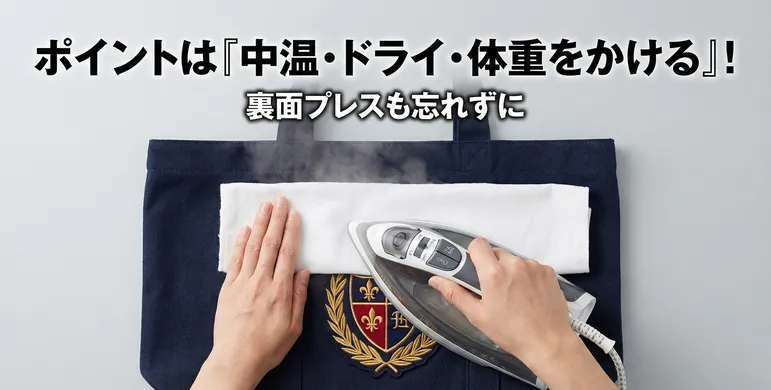 アイロンの温度は「中温」(140℃~150℃)に設定します。スチーム機能は必ずOFF(ドライ)にしてください。スチームの水分が糊の接着を阻害したり、気化熱で温度を下げてしまったりする原因になります。 ※ナイロンやポリエステルなど熱に弱い素材に貼る場合は、低温から様子を見るか、あて布を厚めにするなど注意が必要です。