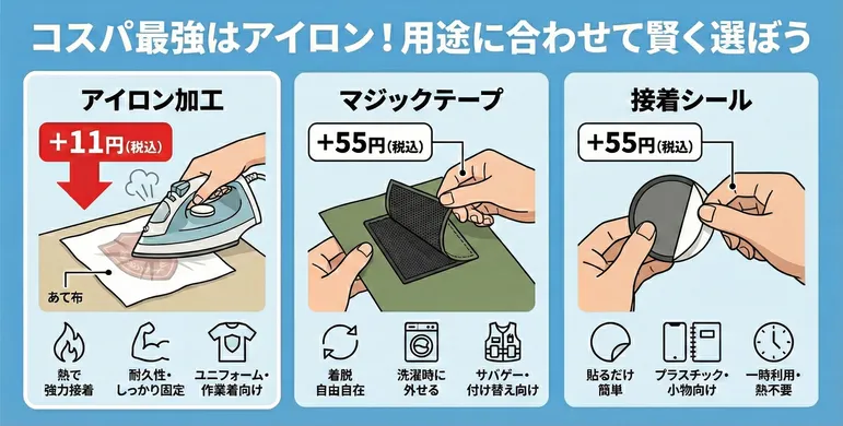 オリジナルワッペンを作る際、アイロン接着以外にもいくつかの裏面加工オプションが存在します。それぞれの特徴を理解して、用途に最も合ったタイプを選ぶことが重要です。ここでは、ホットモバイリーで提供している「アイロンテープ」「マジックテープ」「接着シール」の3つを比較し、なぜアイロンタイプが選ばれるのか、その違いを明確にします。