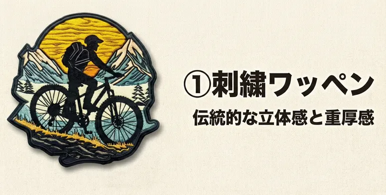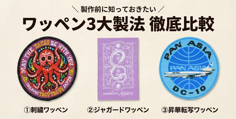 オリジナルワッペンの作り方において、最も重要で、かつ最初に決めるべき要素が「製法(タイプ)」の選択です。デザインの再現性、耐久性、そして完成品の雰囲気がこの選択で決まります。ホットモバイリーでは、大きく分けて「刺繍」「ジャガード織」「昇華転写」の3つのタイプをご用意しており、それぞれの特性を理解することで、目的に合致した最適なワッペンを作ることができます。