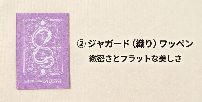 「デザインが細かすぎて刺繍では潰れてしまうかもしれない」そんな悩みを解決するのが「ジャガード織タイプ」です。これは生地の上に糸を刺すのではなく、経糸(たていと)と緯糸(よこいと)を複雑に組み合わせて、生地そのものを織り上げながらデザインを表現する製法です。