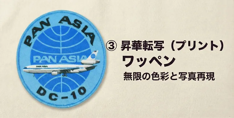 これは、専用のインクを気化(昇華)させて生地を染めるフルカラープリント技術を用いた作り方です。糸の色数に制限されることなく、データ上の色をそのまま鮮やかに発色させることができます。「風景画をそのままワッペンにしたい」「水彩画のような淡いタッチを残したい」といった要望に対し、驚くほどの高解像度で応えることが可能です。