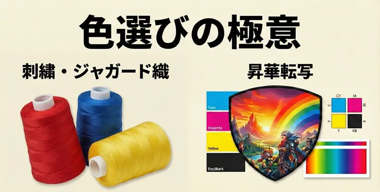 ワッペンの「作り方」において、実は製法と同じくらい重要なのが「色の選定」です。モニターで見ているデザインの色と、実際の糸やインクの色には特性の違いがあります。ここを理解して指定することで、イメージとのギャップをなくし、より完成度の高いワッペンを作ることができます。