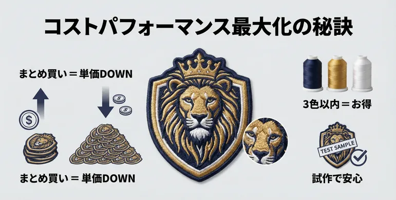 コストを抑えるためのより具体的なテクニックとして、「色数」のコントロールがあります。 ホットモバイリーの刺繍ワッペンは、使用する刺繍糸が「3色まで」であれば基本料金内で製作可能です。4色目以降は、1色追加ごとに1枚あたり22円(税込)の追加料金が発生します。 「たった22円」と思うかもしれませんが、例えば1000枚製作する場合、22,000円の差になります。ロゴデザインを工夫して3色以内にまとめたり、前述した「生地の色」を4色目の色として有効活用したりすることで、クオリティを落とさずにコストだけを賢くカットすることができます。