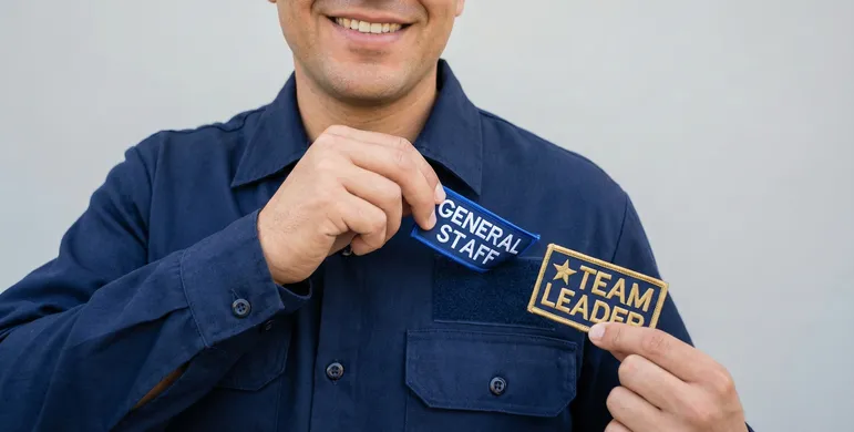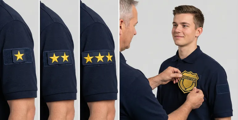 飲食店や販売店、技術職の現場などでは、スタッフの熟練度がひと目で分かると便利です。 例えば、研修が終わったら「若葉マーク」を外す、試験に合格したら「星(スター)」のワッペンを追加する、社内の資格を取ったら「マイスター」のエンブレムを渡す、といった使い方ができます。 服に直接刺繍する場合、昇格するたびに新しい制服を用意しなければならず大変ですが、マジックテープワッペンなら、その場で新しいランクのワッペンを手渡すだけで済みます。「今日から君はリーダーだ」と言ってワッペンを貼り替える瞬間は、本人にとって何よりの自信になり、仕事への責任感が大きく高まります。